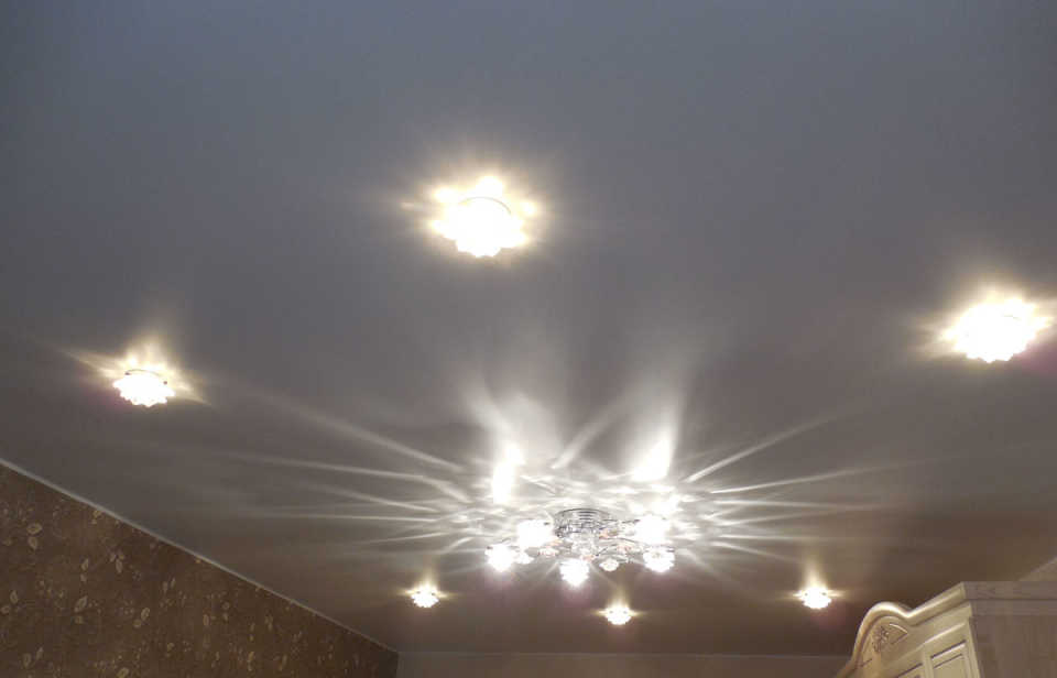 В наши дни есть множество осветительный приборов, которые можно использовать в натянутых полотнах. Пленка ПВХ не способна удержать на себе элементы освещения. Поэтому крепят светильники на базовое потолочное перекрытие