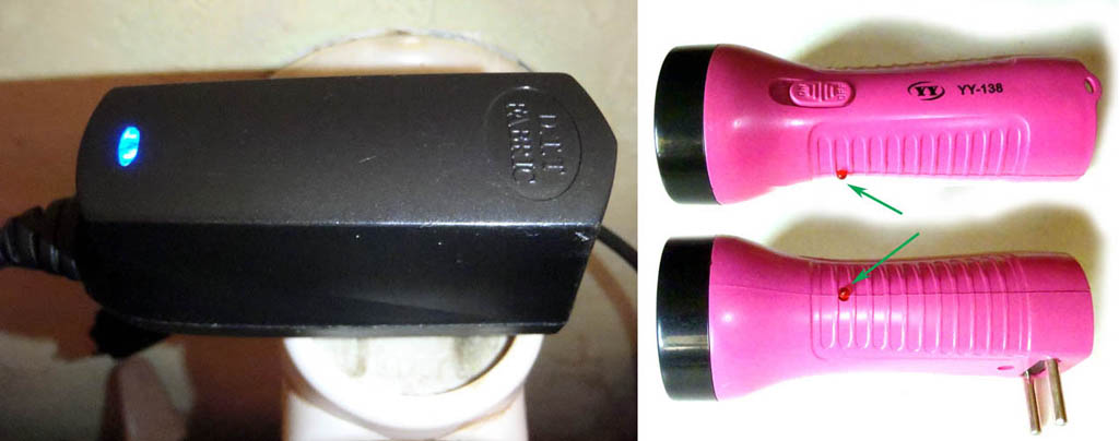 Третье, предположим, что у вас нет тестера, индикатора-фазоуказателя и вы вообще представления не имеете, что это такое. В таком случае проверить наличие напряжения в квартире при пробном включении, не рискуя собой и дорогой техникой, можно с помощью зарядного устройства для телефона со световым индикатором (слева на рис.) или светодиодного фонарика с подзарядкой (справа). Зарядку включают в розетку без телефона, а фонарик – не включая света. Ни в каких нормативных документах возможности использования этих устройств в таком качестве не предусмотрено, но для дилетанта они даже безопаснее индикатора фазы и тестера: ухватиться по неопытности за оголенную часть щупа или пытаться померять напряжение тестером, включенным на измерение тока, невозможно. Сами «квази-индикаторы» на аварийной сети могут выйти из строя (проводники внутри них очень тонкие), но они недороги и ремонтопригодны. Однако мы забегаем вперед, сначала нужно добраться туда, где выбило.
