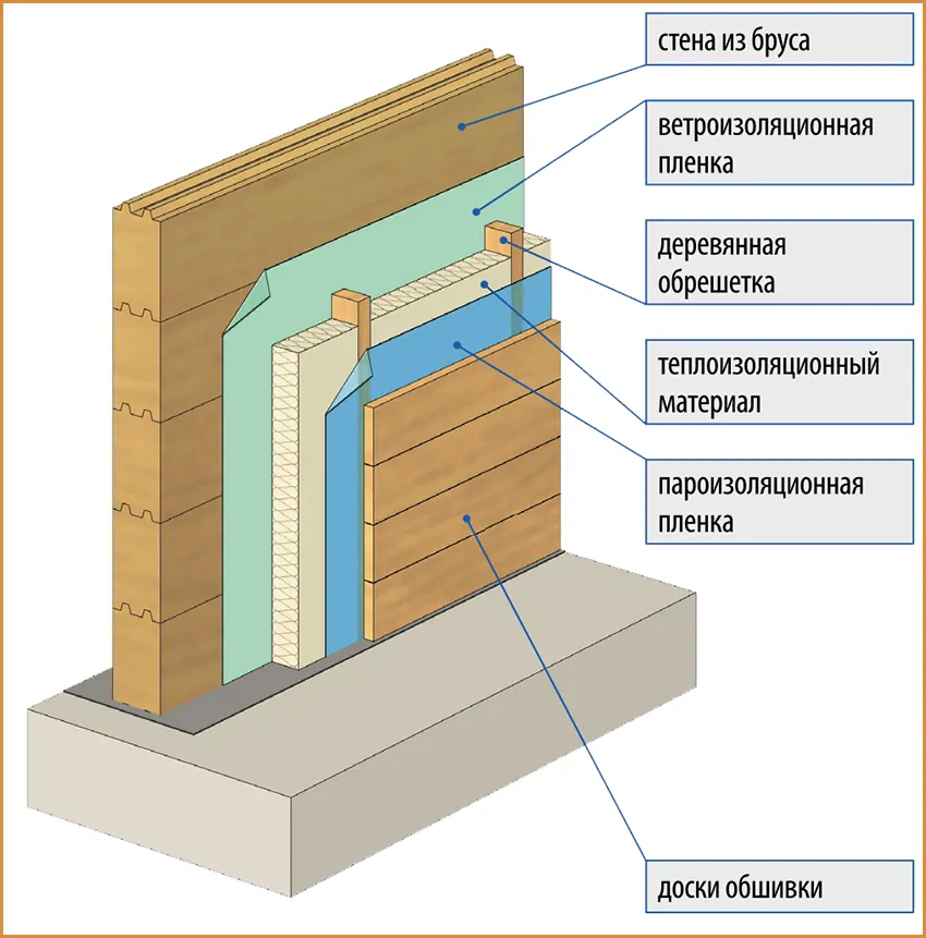 Для качественного утепления потребуется сделать «пирог». В данном случае это будет несколько слоев различных материалов, у каждого из которых свое предназначение. В зависимости от того, какой был выбран материал для утепления, монтаж может осуществляться при помощи клея или создания каркаса.