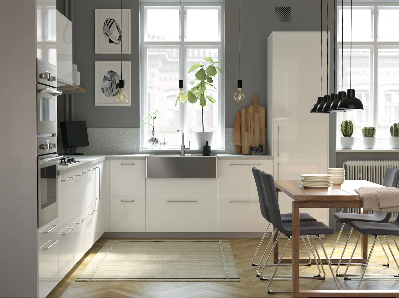 Стоит заказывать кухню у местных производителей. На таком рынке невероятно большая конкуренция, и все давно применяют немецкое оборудование, а также материалы. Если вы будете заказывать из-за границы, то лишь переплатите за доставку европейским рабочим. Качество при этом не будет лучше Внутреннее изготовление ящиков – фасады МДФ, ДСП, столешница из ламинированного ДСП под древесину (остальные варианты выглядят ужасно, а древесина лучше) или камень искусственного происхождения, что будет куда дороже. Фартук стеклянный или придется раскошелится на классную плитку площадью от 1.5 до 2 м2 (не стоит использовать белую фугу для затирки плиточки на фартуке). Оптимальным цветом кухонных фасадов будет белоснежный глянец. Он почти волшебный, потому что на нем вообще не видно грязи. Верхние ящики стоит спланировать с обычным открыванием распашного типа – петли с доводчиком при подобном варианте будут стоить лишь 200 рублей за штуку. Подъемные механизмы сверху будут стоить намного дороже, а преимуществ они не дают. Снизу есть выдвижные ящики и они куда удобнее, но и дороже – тут стоить смотреть по бюджету.