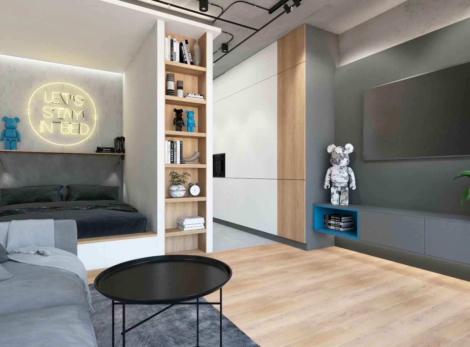 Ламинат хорошо сочетается с керамогранитом, к тому же комбинированный вариант более практичен в эксплуатации. Проект квартиры-студии для молодого человека, дизайнер Светлана Шалыго
