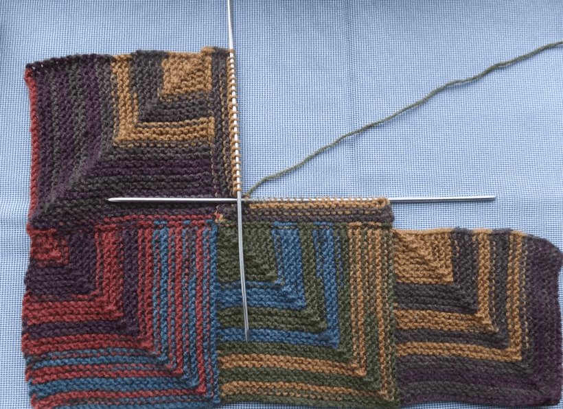 Следующий этап вязания пэчворка спицами с описанием – создание второго геометрического элемента. Традиционно необходимо нанизать на спицу 15 новых петель и 16 дополнительных по кромке уже созданного квадратика: выведите спицу за кромку и вытяните петлю. При создании этого элемента убавляйте центральные петли в каждом втором ряду, как и при формировании первого квадратика.