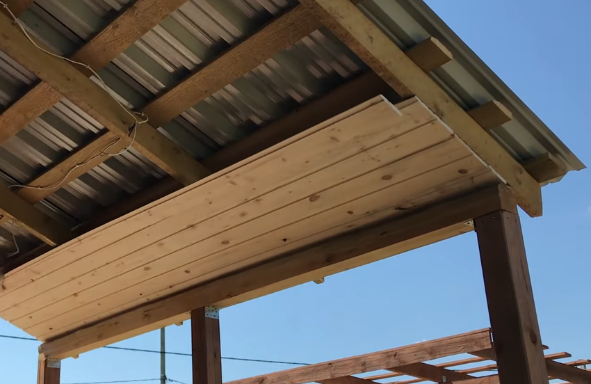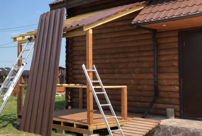 Для создания навеса над террасой рекомендуют использовать облегчённые металлические рейки. Стропильная система из облегченного бруса добавит эстетичности и прочности будущему сооружению. В качестве покрытия используют металлочерепицу, поликарбонат и профильный настил. При выборе материала необходимо учитывать его декоративность.
