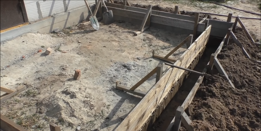 - Далее по обеим сторонам ямы выстраиваются борта, укрепленные подпоркам, – опалубка заданной высоты.