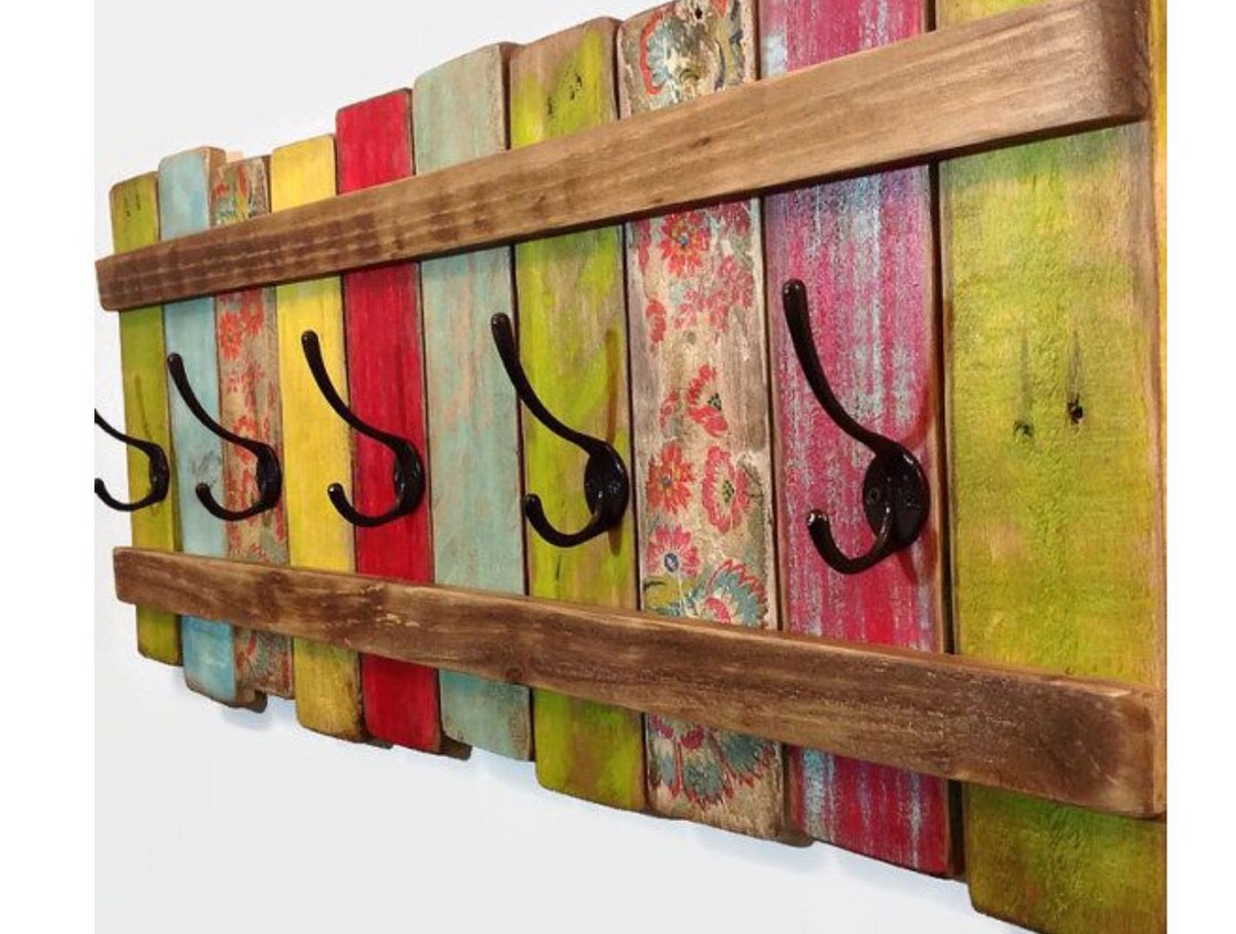 После, детали покрывают краской или лаком. В навесном способе создания, делают «ушки» – маленькие круглые металлические вставки. Просверливают отверстия, чтобы закрепить шурупы в дюбели. Существует и альтернативный способ, который заключается в монтаже сквозных отверстий. Их используют для крепления конструкции на стену через них. В завершение процесса присоединяют крючки для одежды. Их можно расположить рядами или хаотично.