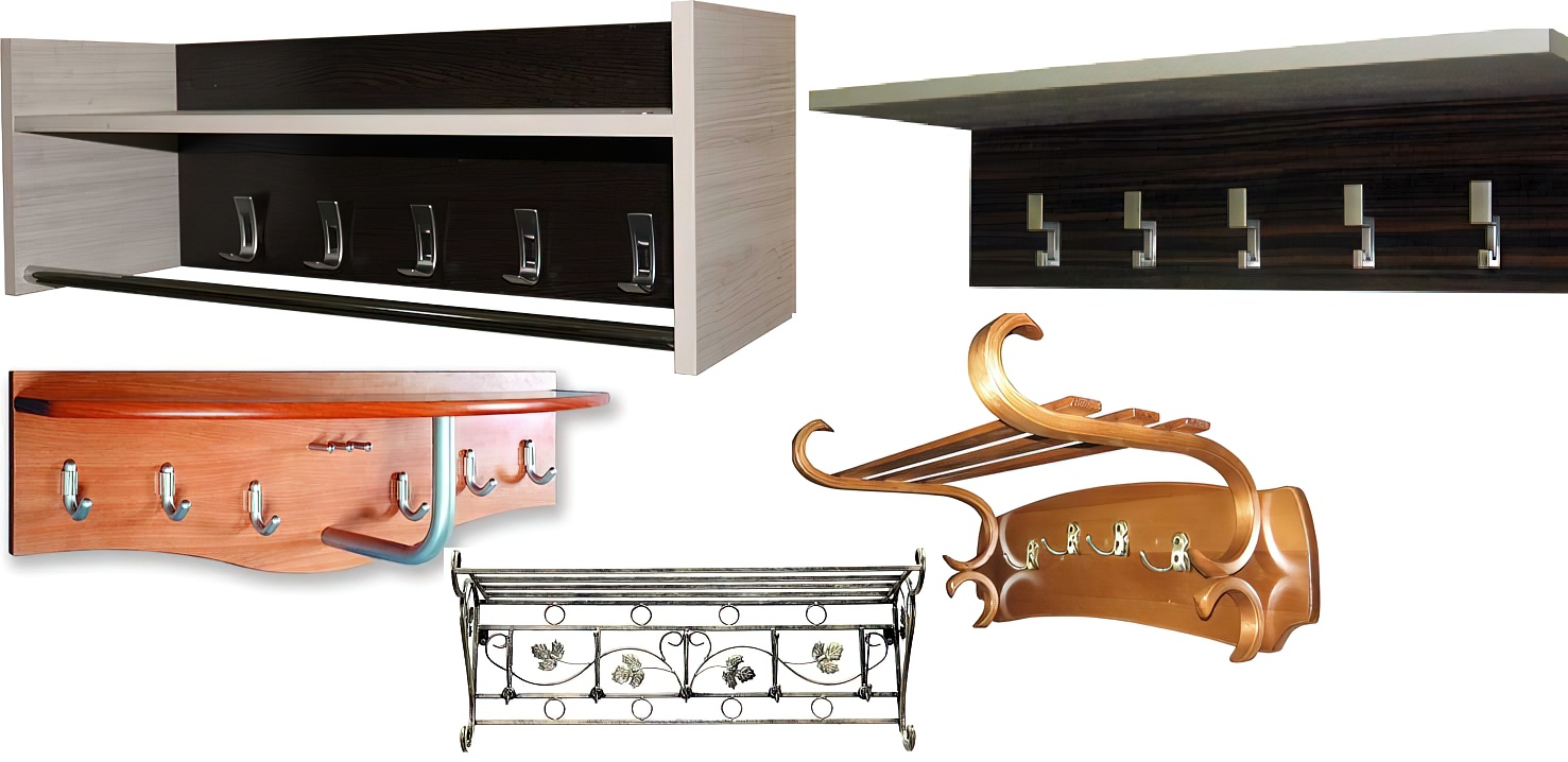 Крючки с полкой для хранения головных уборов. Данная модель отличается функциональностью. С ее помощью можно грамотно разместить не только верхнюю одежду, но и шапки, перчатки, зонтики и другие аксессуары.