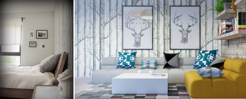 Этот стиль любит светлые тона и дерево. Мотивы мы можем выбрать и для декора стен, оклеив одну из них узором, например, имитирующим березу, а вторую – имитирующим древесину из досок или сделав ее однотонной белой или серой. Такие решения очень популярны в последнее время. Тема стволов березы в дизайне жилых комнат является хитом. Для естественной аранжировки обои с мотивом деревьев станут идеальным вариантом.