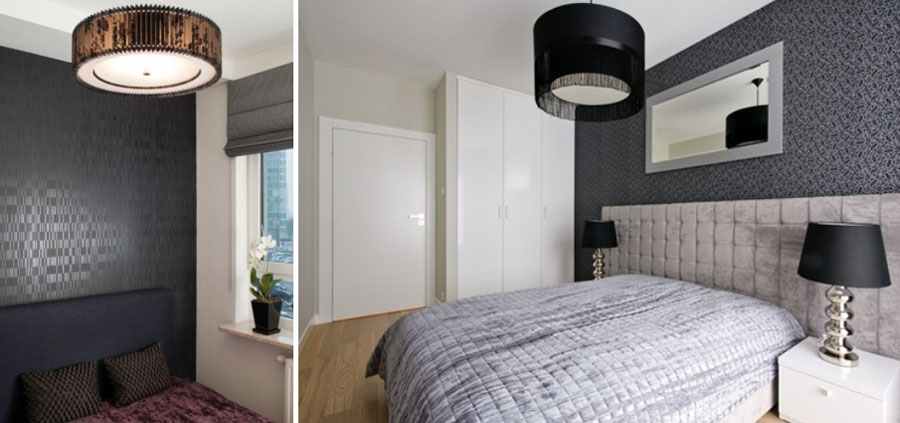 Стену за кроватью можно сделать темной, даже черной или серебристой, темные цвета оптически уменьшает комнату, если же мы выбираем светлые остальные стены, а также светлые дополнения, например, белую кровать и покрывала, то комната не будет выглядеть маленькой. Графитная блестящая стена придаст комнате камеральный характер.