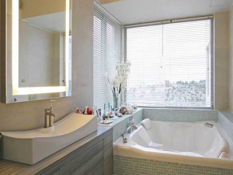 Ещё одним способом украсить помещение является установка различных типов освещения в разных частях ванной. Там, где находится зона для расслабления, будет более уместен рассеянный свет. В той части, где стоит умывальник и зеркало, больше подойдёт прямая подсветка.
