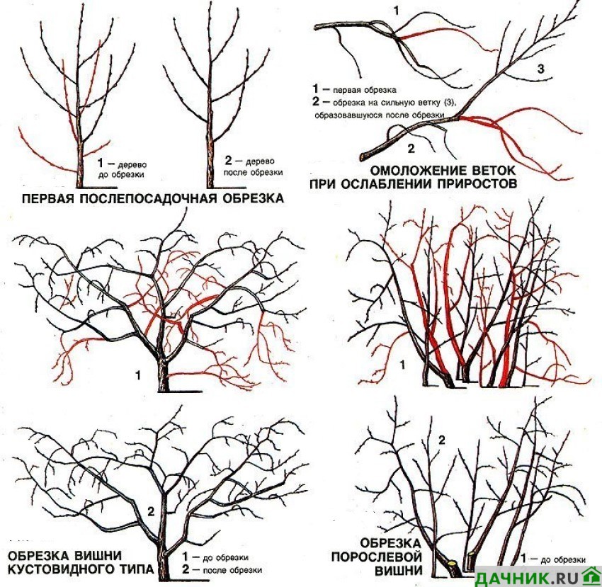 Обрезки вишнёвых деревьев бывают формирующие, санитарные и омолаживающие с сильным прореживанием кроны. Формировать и омолаживать кустовидную вишню следует в промежуток покоя деревца, оптимально – весной. Не рекомендовано обрезать растение, когда на улице температуре ниже —5 °C. А вот удалять больные, повреждённые, сухие ветви можно в любое время года, кроме зимы.