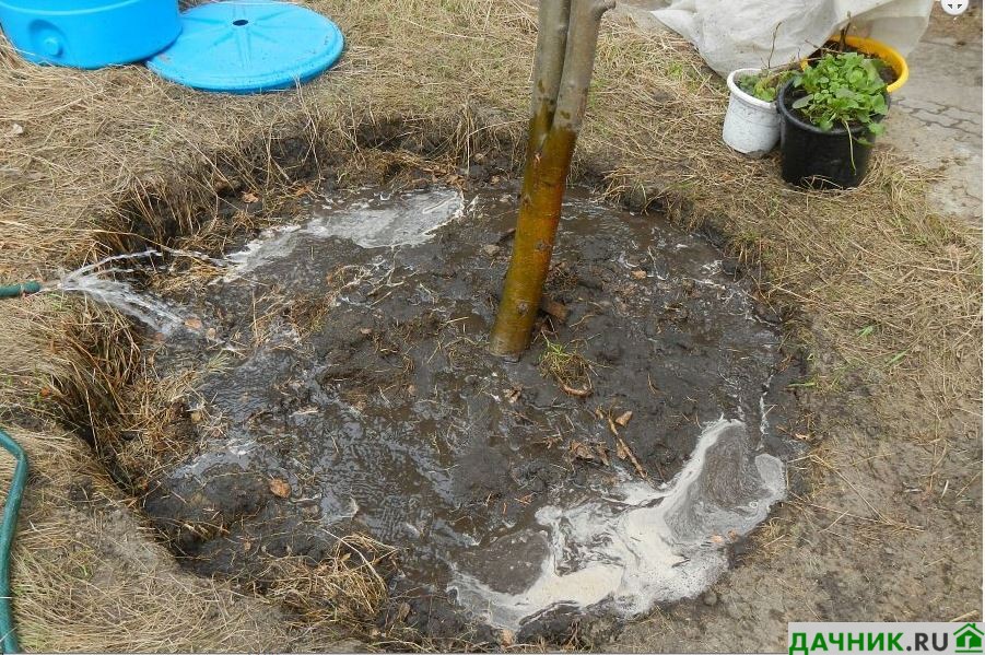 - Яму полностью заливают водой. К посадке приступают только тогда, когда жидкость полностью впитается.