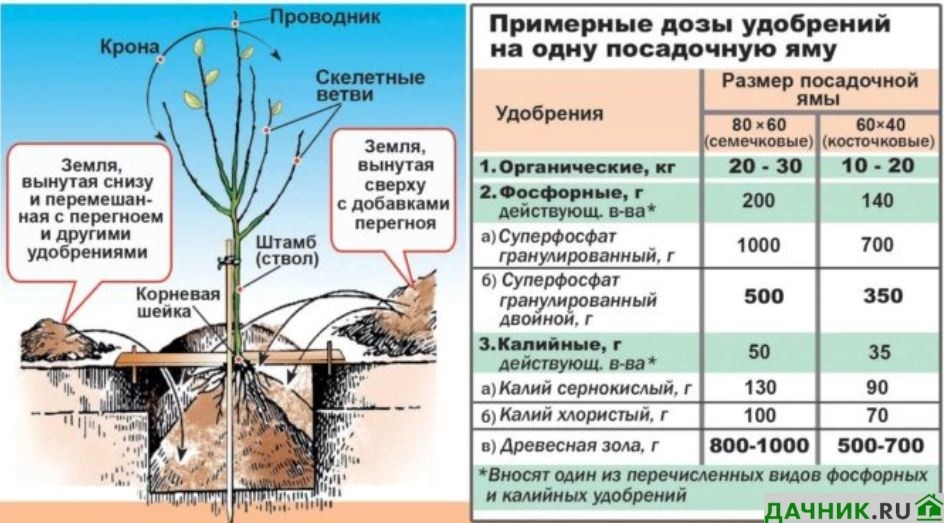 - При посадке саженцев в каждую лунку засыпают 50 г суперфосфата, 6 кг перегноя и 50 г хлорида калия;
