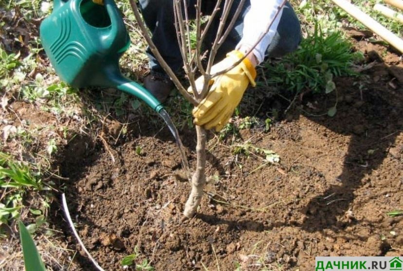 - Грунт вокруг деревца утрамбовывают, затем на расстоянии 30 см от ствола выкапывают лунку и поливают вишню 20 л воды.
