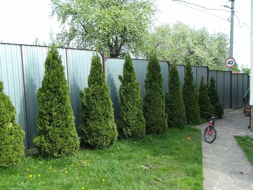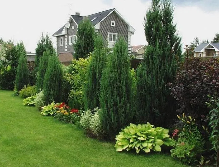 Вдоль невзрачной изгороди часто высаживают плотные ряды кустарников или деревьев. Украсить забор поможет вечнозеленая западная туя, ягодный тис или обыкновенный можжевельник. Если живую ограду планируют состригать, то лучше посадить барбарис Тунберга, пурпурную иву или боярышник.
