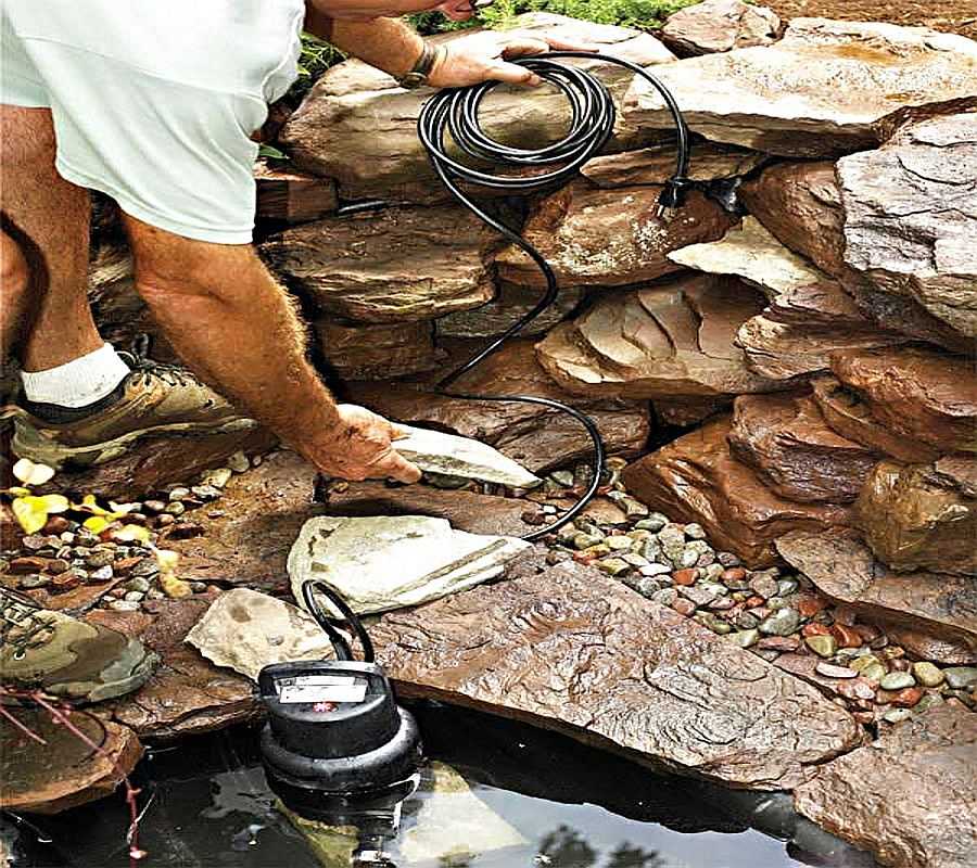 После того как будет установлен камень, можно присоединять насос. Если конструкция небольшая, хватит агрегата с мощностью 70 Вт. Для больших каскадов лучше выбрать насосы наземного типа, обладающие большей мощностью. Чтобы механизмы явно не бросались в глаза, их придется задекорировать растениями и камнями. Шланги располагают между камнями, опять же для того, чтобы они были незаметны.