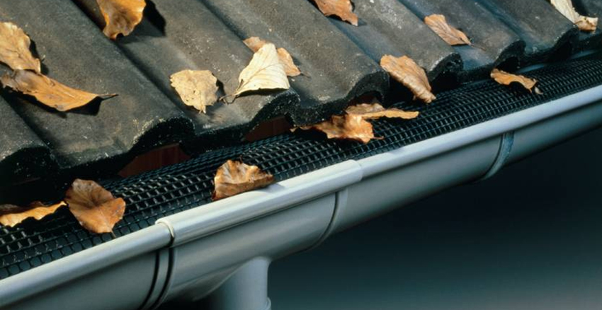 - очистка желобов от мусора, который попадает с крыши. Это можно сделать при помощи лестницы и веника. Простоту данной операции могут обеспечить установленные по всей длине желоба защитные сетки.