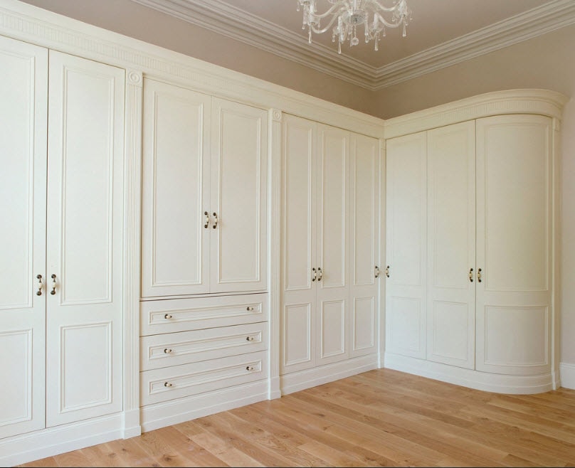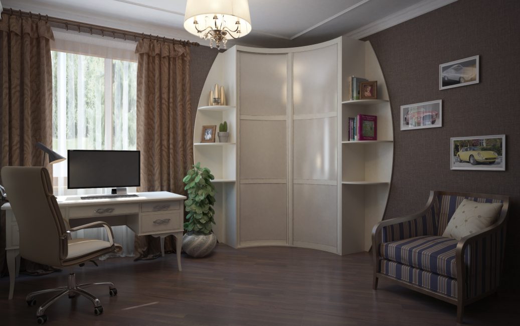 Радиусный. Подразделяется на вогнутые модели и выпуклые. Первые ненавязчиво создают дополнительный объем. По сути, служат модификацией треугольных шкафов. Вторые обыгрывают Г-образные силуэты. Мягкие линии хорошо вписываются в модерн, хай-тек, романтизм, эклектика.