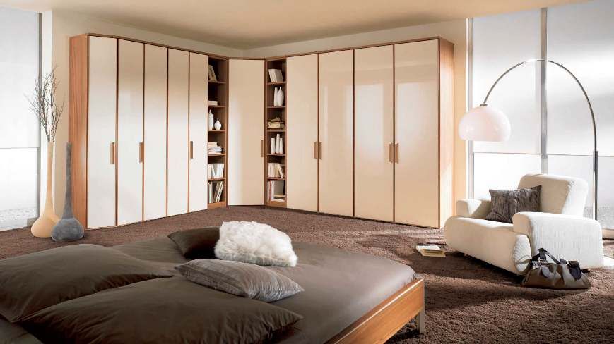 5Радиусные. Самые сложные в выполнении и дорогие угловые шкафы-купе, поэтому встречаются они редко. В спальне с обычным, классическим дизайном и набором мебели, такие модели будут смотреться нелепо. Они впишутся лишь в роскошный интерьер, например, выполненный в стиле ампир или арт-деко, в магазинах они обычно отсутствуют и изготавливаются на заказ.