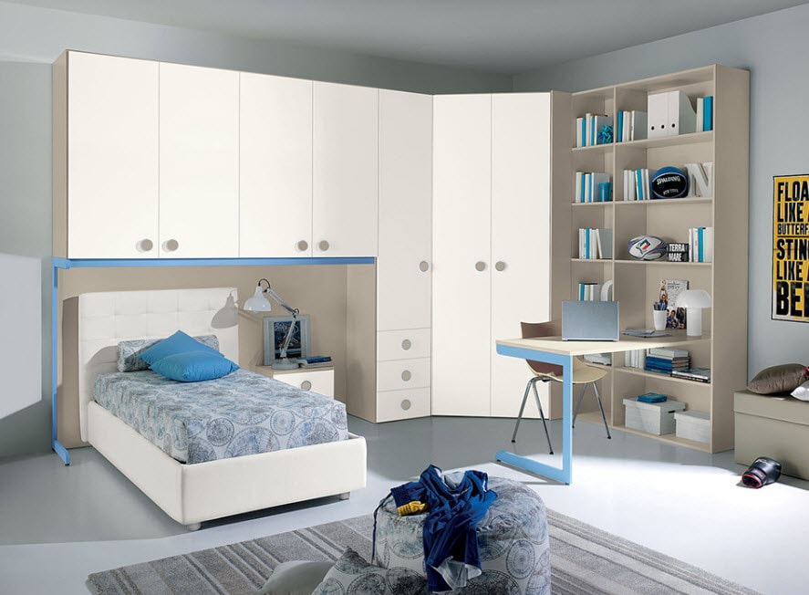С антресолями. Иногда высота потолков позволяет сверху или сбоку шкафа расположить антресоли. При этом нужно учитывать, что не стоит их вешать над кроватью, поскольку модуль с вещами весит прилично. Лучше антресоли разместить на свободной стене. Например, над рабочим столом.
