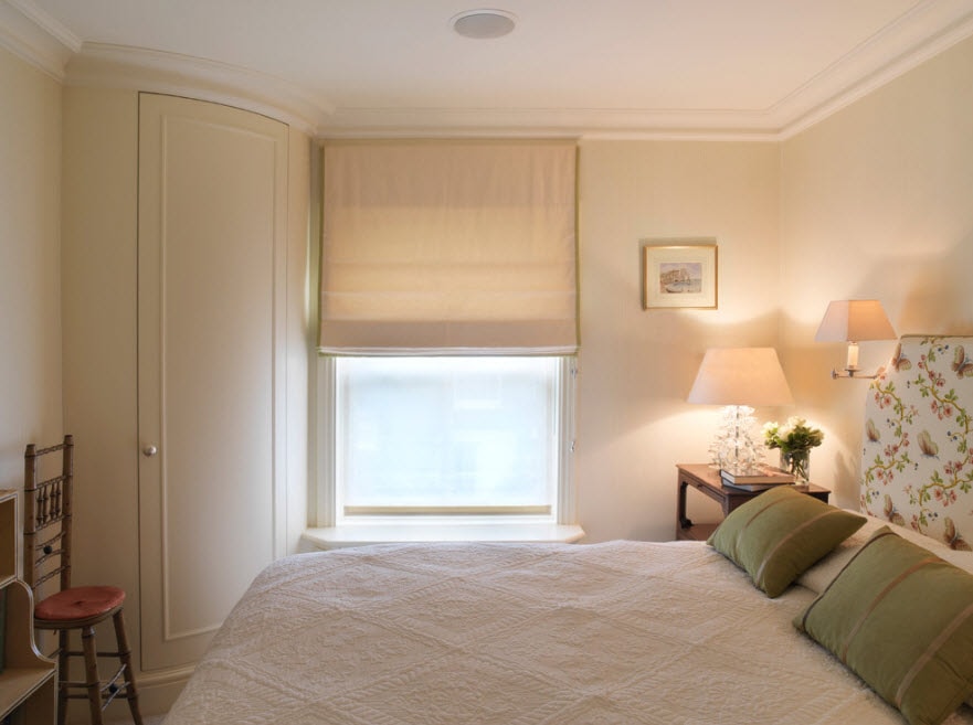 Угловое расположение шкафчика обычно определяет компактность размеров этого предмета интерьера. Дизайну комнаты с таким элементом обстановки всегда присуща аккуратность. Вариант идеален для малогабаритных пространств. Особенно, если используется шкаф-купе. Хрущевка или маленькая студия от присутствия подобной системы хранения всегда выигрывает.