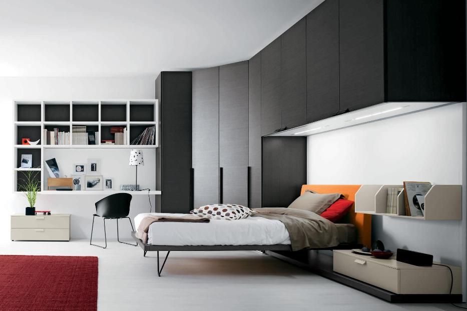 Возможно, вас заинтересует вариант размещения кровати в шкафу, если есть необходимость в дополнительном спальном месте, а площадь квартиры совсем мала. В этом случае матрац с подъемным механизмом надежно и незаметно прячется за дверцей.
