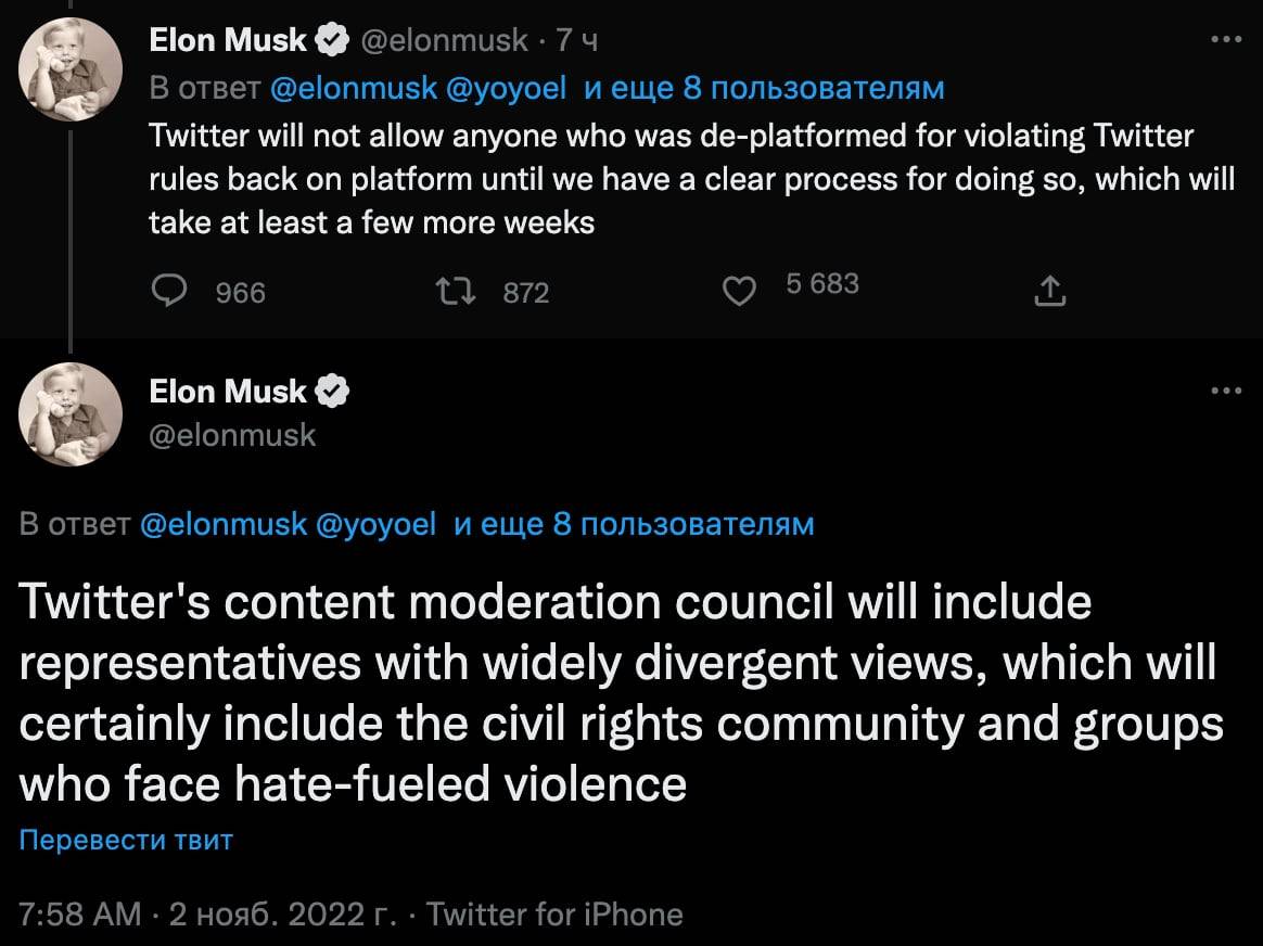 Маск заявил, что Twitter не будет восстанавливать удаленные профили в ближайшие несколько недель, пока не будет настроен четкий процесс для этого.