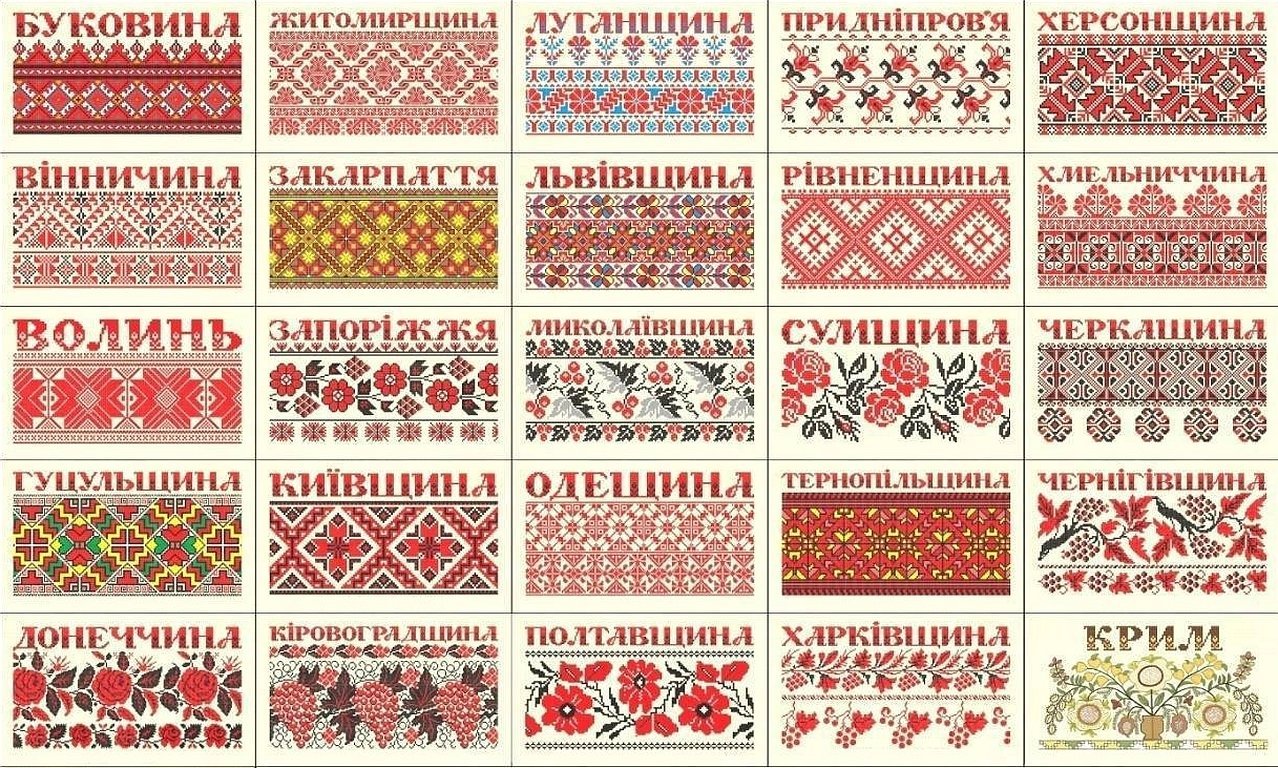 В качестве узоров могут служить даже разнообразные фигуры. Орнаменты для вышивки крестом имеют скрытое значение, указывают на народную принадлежность. Русские орнаменты состоят из геометрических фигур и прямых полос по краю материи или сочетают различные узоры.