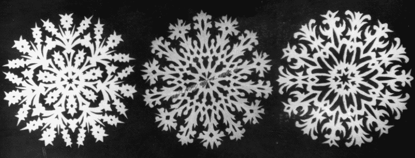 Снежинки – могут быть симметричными, вырезанными по привычной схеме со складыванием треугольника, либо оригинальными, с настоящими сюжетами внутри.