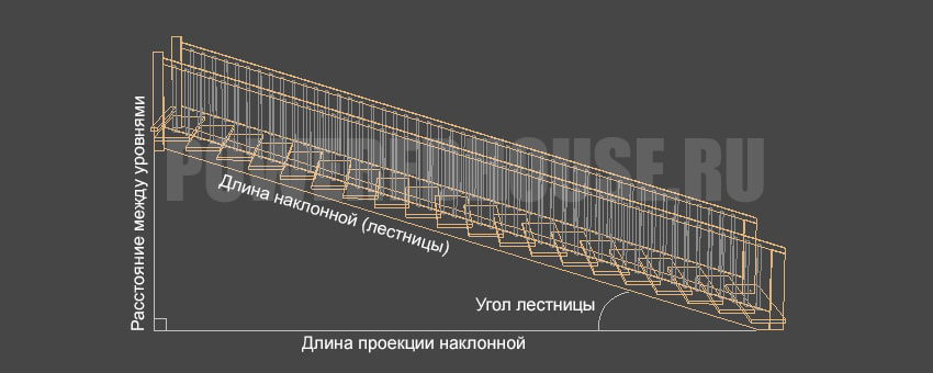 - Следующие параметры, которые можно знать — угол наклона лестницы или длина проекции наклонной.
