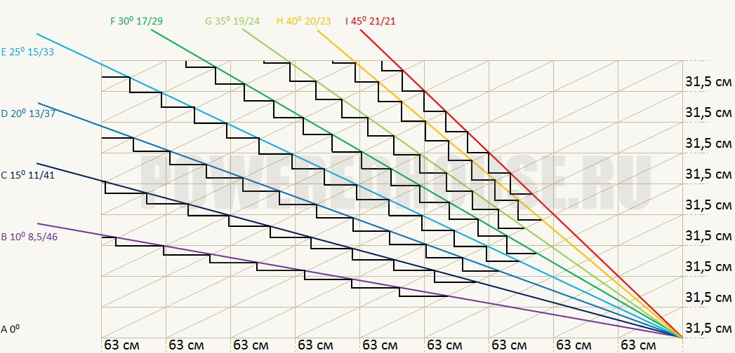 Например, если угол составляет 33 градуса, ширина ступени определяется как 26 см, а ее высота – 17 см. Если наклон 37 градусов, ширину уменьшают до 34 см, а высоту, наоборот, увеличивают до 18 см. При наклоне лестницы в 45 градусов и ширина, и высота соотносятся 1:1, то есть 20 см на 20 см.