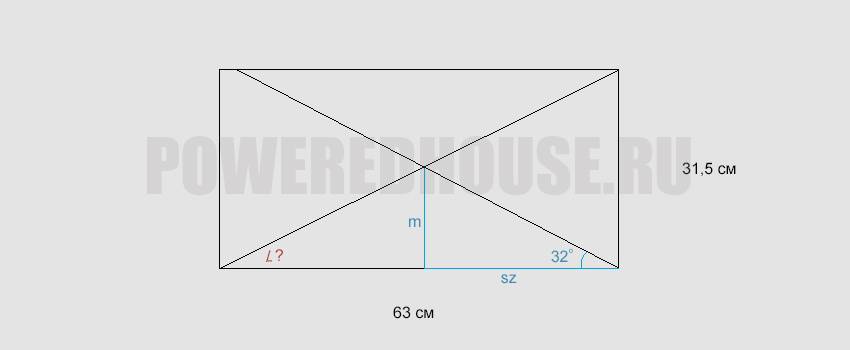 В прямоугольном треугольнике с катетами 63 и 31,5 определим неизвестную гипотенузу и угол противолежащий катету со значением 31,5. Гипотенуза равна корню из суммы квадратов катетов. Рассчитав, получается значение 70,44. Теперь, зная три стороны треугольника, можно найти неизвестный угол по рассмотренной выше формуле. Получаем, угол = arccos((63² + 70,44² — 31,5²) / (2 × 63 × 70,44)) × 180 / π. Угол ≈ 26,56°.