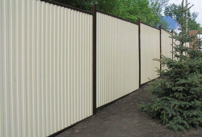 Профнастил может быть как просто оцинкованным, так и крашенным. Последний вариант не только делает забор более эстетичным, но также гарантирует долговечность конструкции.