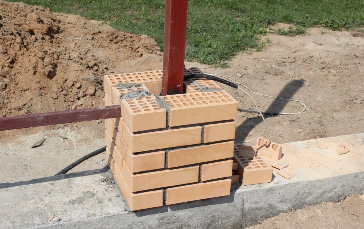 Кирпичи выкладывают вокруг арматуры и после каждого ряда укрепляют армирующей лентой. Ширина такого столба, как правило, равняется полутора кирпичам. Когда опора готова, внутрь заливают цементный раствор, верхнюю часть накрывают заглушкой – для предохранения от влаги.