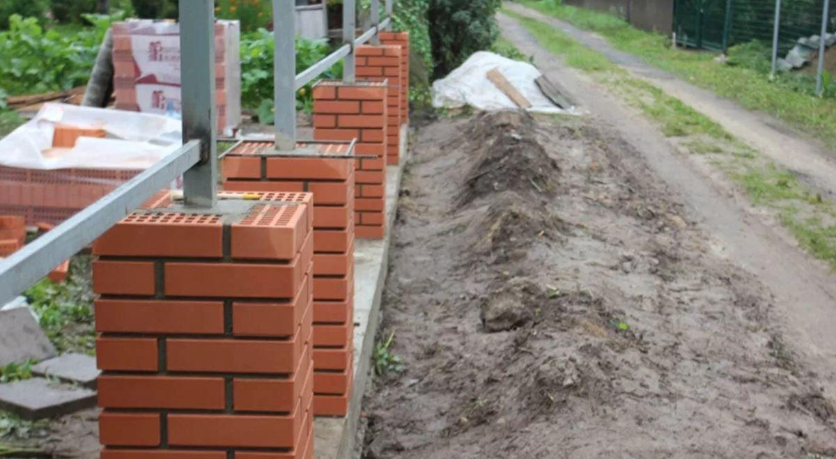 Процесс монтажа забора с кирпичными опорами потребует больше времени и подготовительных операций. Первый этап – кладка столбов на бетонированный фундамент.
