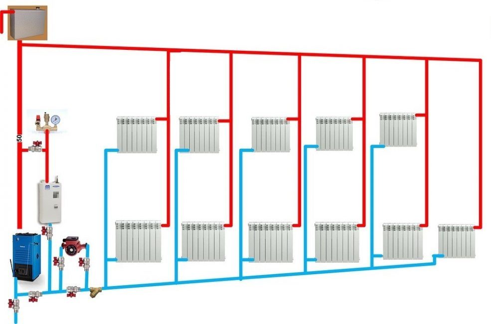 В многоэтажных зданиях такая система применяется часто, в качестве основного материала используется стальная труба (в частных отопительных системах допустимо применение полипропилена или металлопластика).