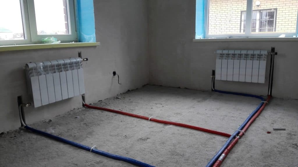 Монтаж труб подачи и обратки вдоль пола позволяет максимально скрыть коммуникации. Допускается укладка трубопровода внутри стен, в полу, за плинтусом, но даже при открытом расположении труб отопительная система хорошо вписывается в интерьер.