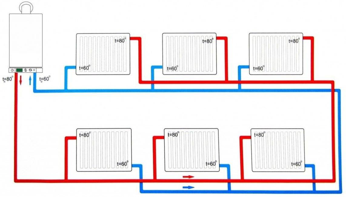 - обеспечения всей радиаторов одинаковым по степени нагрева теплоносителем. Это позволяет избавиться от проблемы, характерной для однотрубной системы, при которой самая дальняя от котла батарея не позволяет обеспечить достаточный уровень обогрева помещения;