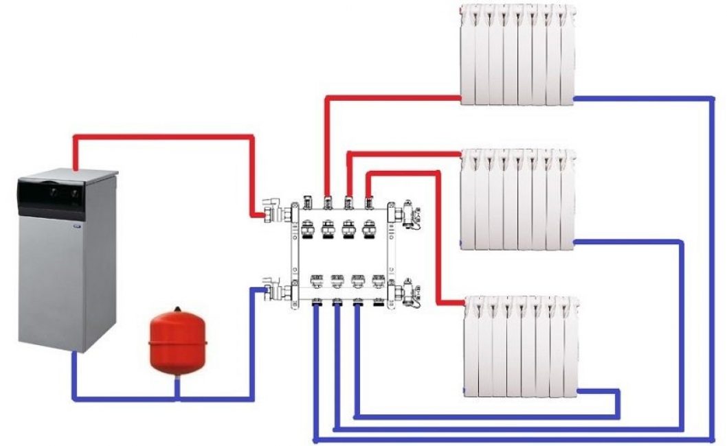 - Лучевая. От двух общих для этажа коллекторов к каждому из радиаторов подходит две трубы. Сами коллекторы подключены к общему котельному оборудованию. При такой схеме можно подключать к отоплению не только батареи, но и «теплый пол». Прокладку лучевой системы необходимо выполнять еще на этапе строительства дома, т. к. внедрять ее в уже готовую постройку будет крайне тяжело.