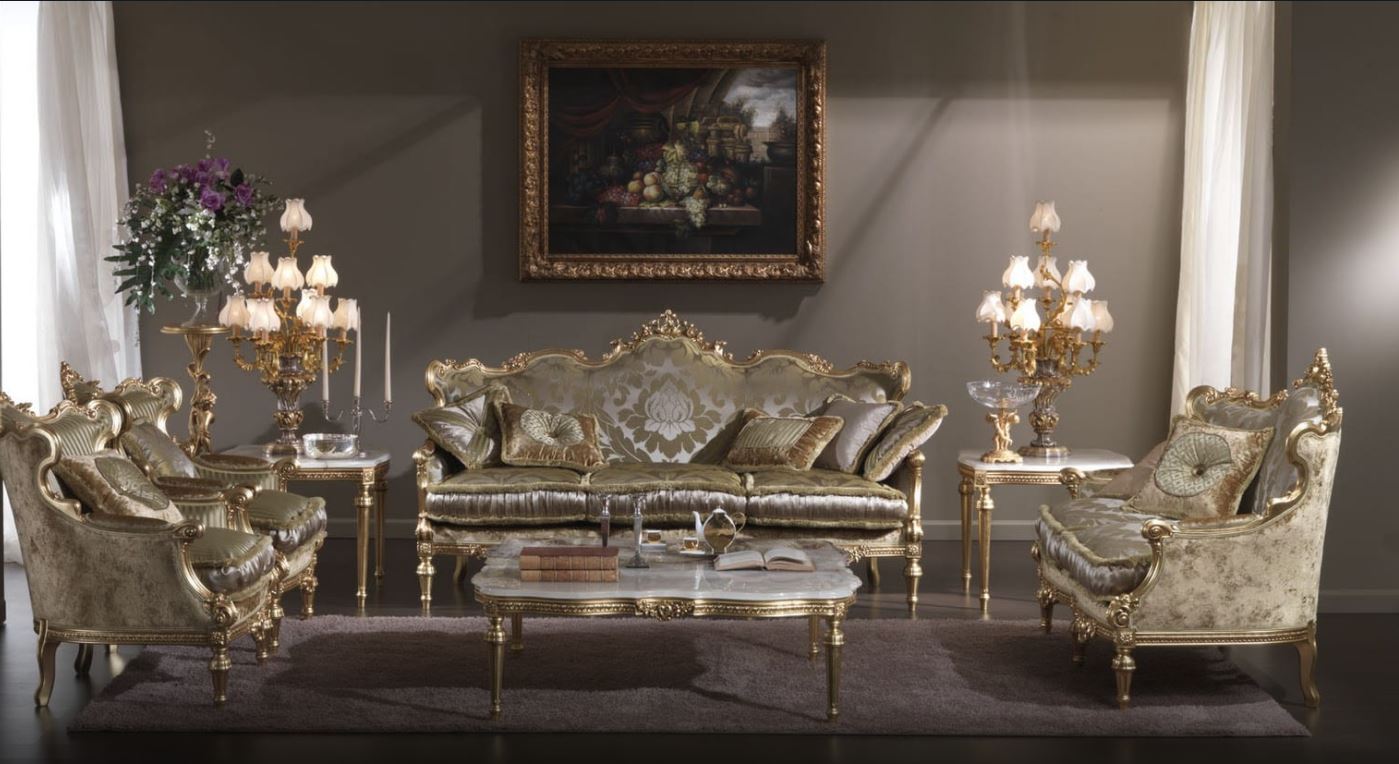 Классический набор мебели включает диван и пару кресел, маленький журнальный столик или тяжеловесный стол, крупный шкаф, украшенный резьбой. Дополнительно можно поместить в гостиной книжные шкафы, комоды со множеством полочек, пуфы. Канапе-кушетка с 2 или 3 парами ножек может стать «изюминкой» помещения. Допускается использовать большое количество предметов мебели, если размер комнаты позволяет это. Не должно складываться впечатления, что гостиная захламлена. При расстановке не нужно заставлять углы, старайтесь расположить мебель в центре комнаты.