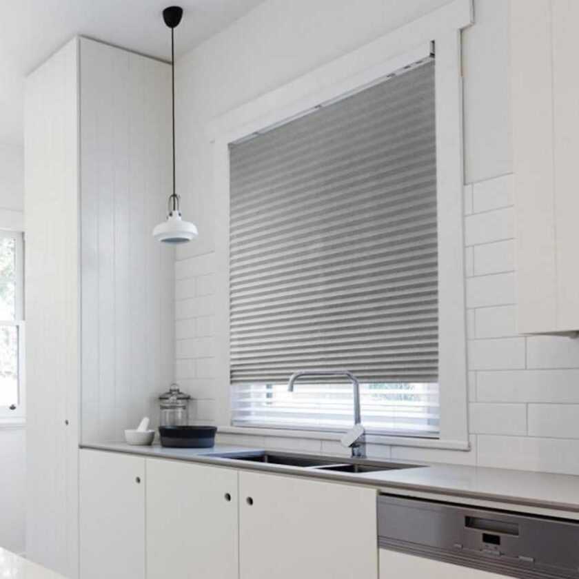 вы можете сэкономить место на кухонном подоконнике, установив кассетные жалюзи, которые полностью собраны в верхней кассете.