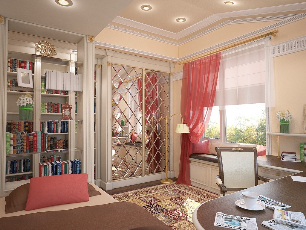 Не следует использовать в интерьере много зеркал, если окна выходят на солнечную сторону, этот прием будет уместен в маленьких комнатах с недостатком солнечного света. В такой комнате можно оформить всю стену или потолок, но желательно, чтобы эта стена находилась напротив окна.