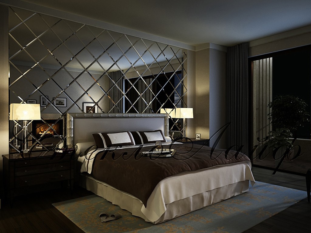 В спальне. В отличие от гостиной, дизайн в спальне, предполагающий зеркальные панели или литую пленку, прикрепленные на стену как обои, считается не только уместным, но и может привнести некоторые пикантные моменты в семейную жизнь. Однако и здесь можно проявлять больше фантазии, например, наклеить ряд стикеров в форме сердечек или сделанную на заказ большую наклейку – картину. зеркальные часы или панно. Фото декоративных элементов в дизайне спальни сегодня поистине поражают разнообразием.