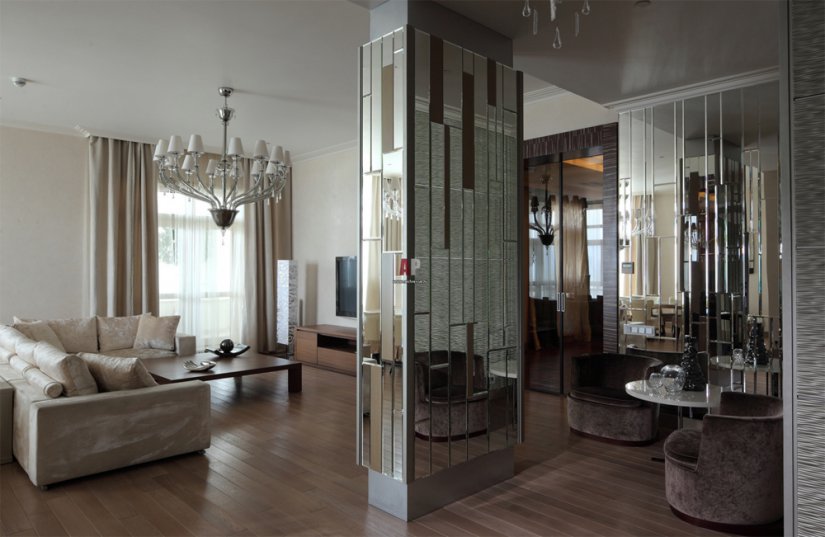 Межкомнатная перегородка, обрамленная зеркальной плиткой