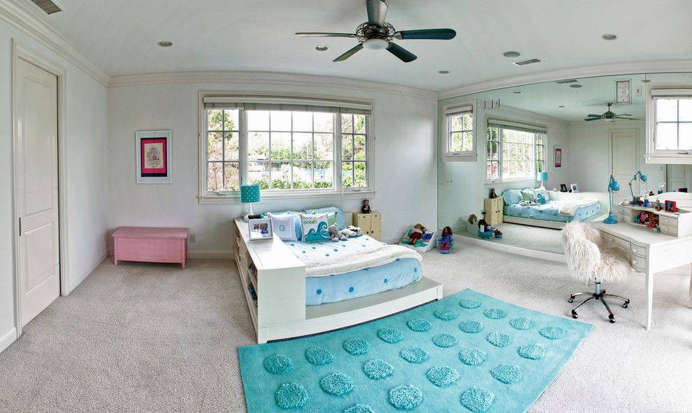 В детской. Многие родители интересуются, можно ли использовать зеркальные панели или клеить пленку не только в прихожей или ванной, но и на стену в детской. Дизайнеры говорят, что можно, а вот психологи категорически против. Детская психика весьма подвижна, игра воображения ребенка намного ярче и серьезнее, чем у взрослых, зеркальный «портал» может увести слишком далеко и негативно сказаться на психике. Поэтому, совмещая дизайн от декораторов и советы психологов, лучше принять решение установить на какую-либо часть мебели зеркальное панно или поместить на стену наклейки в виде интересного изображения, либо зеркальные часы. Однако, любой зеркальный декоративный элемент не должен располагаться напротив глаз. То есть, перед поверхностью письменного стола, либо на той стене, куда падает прямой взгляд ребенка перед сном и при пробуждении.