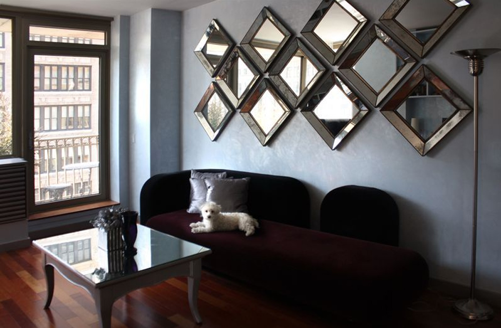 В гостиной. Если поставить в гостиной литую зеркальную стену, обои-пленка с эффектом зеркала или панели, наверняка будет кружиться голова или наблюдаться некоторая дезориентация в пространстве (психологи не раз отмечали такие моменты). Такой способ лучше оставить для прихожей или ванной, в гостиной он подойдет только для заполнения ниш, либо использование полотна как фальш-окна. Также не имеет смысл выкладывать стену плиткой, не подойдет и мозаика. Лучшим вариантом будет зеркальное панно или причудливые стикеры. Если вам, все же, хочется большие зеркала именно в гостиной, дизайнеры предлагают воспользоваться забавным решением – оформить на стене крупный несложный рисунок и оклеить его зеркальной пленкой, излишки обрезать и спрятать под декоративную отделку по окантовке. Особенно красиво в гостиной смотрятся большие зеркальные часы.