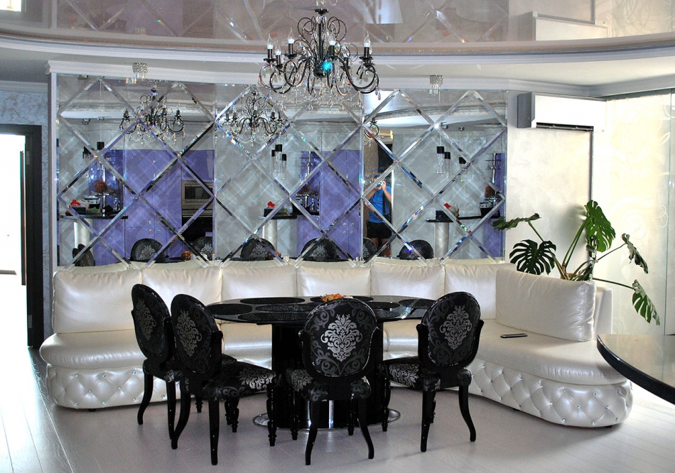 Панно из зеркальных деталей может превратить помещение, оформленное в любом стиле — и в современном, и в классическом, в своего рода арт-объект. Покрытие может быть установлено на различных основаниях: потолках, колоннах, перегородках, но наиболее популярным местом декорирования выступают, конечно, стены.
