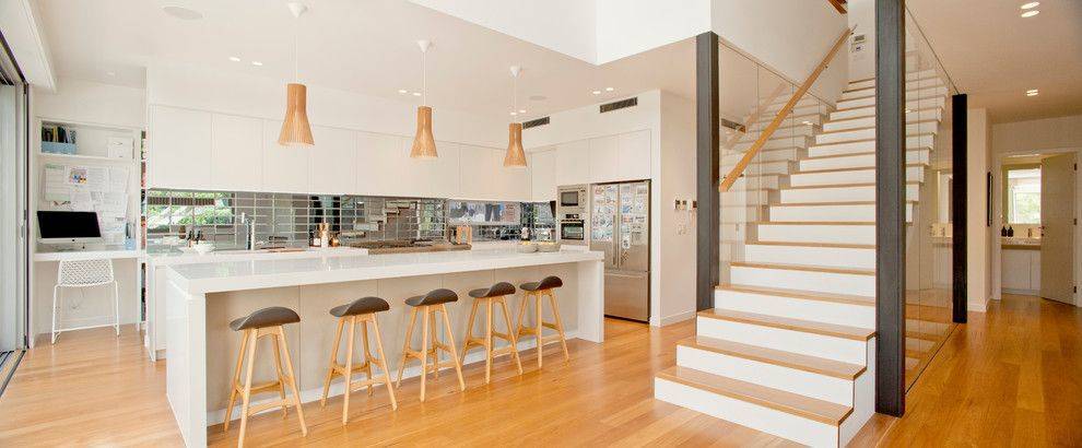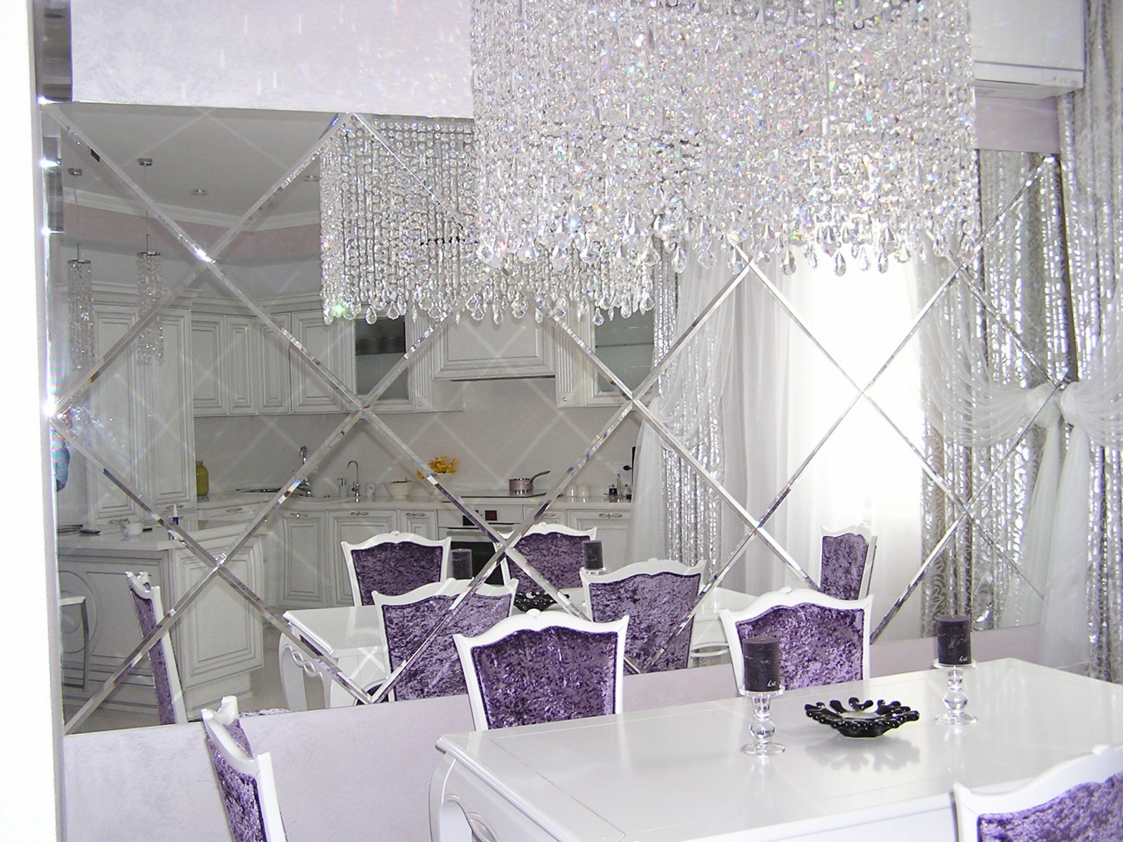 На кухне. В отличие от прихожей, ванной или спальни, в кухне не стоит делать большую стену из зеркальных панелей, пленки или крупной плитки, в фото кухонь чаще встречаются не стена – зеркало, а частичное оформление декоративными элементами. Здесь мы пользуемся опасными предметами, такими, как ножи, либо взаимодействуем с высокими температурами, занимаясь готовкой на плите. При большом размере зеркальной стены может произойти непроизвольная дезориентация в пространстве, и появляется большая вероятность пораниться или обжечься, особенно если панели или крупная плитка находится в поле зрения. В кухне лучше подойдет дизайн, включающий декоративные моменты: панно, наклейку — стикер (она может быть как одна крупная, так и несколько мелких), либо маленькие кусочки плитки – мозаику.