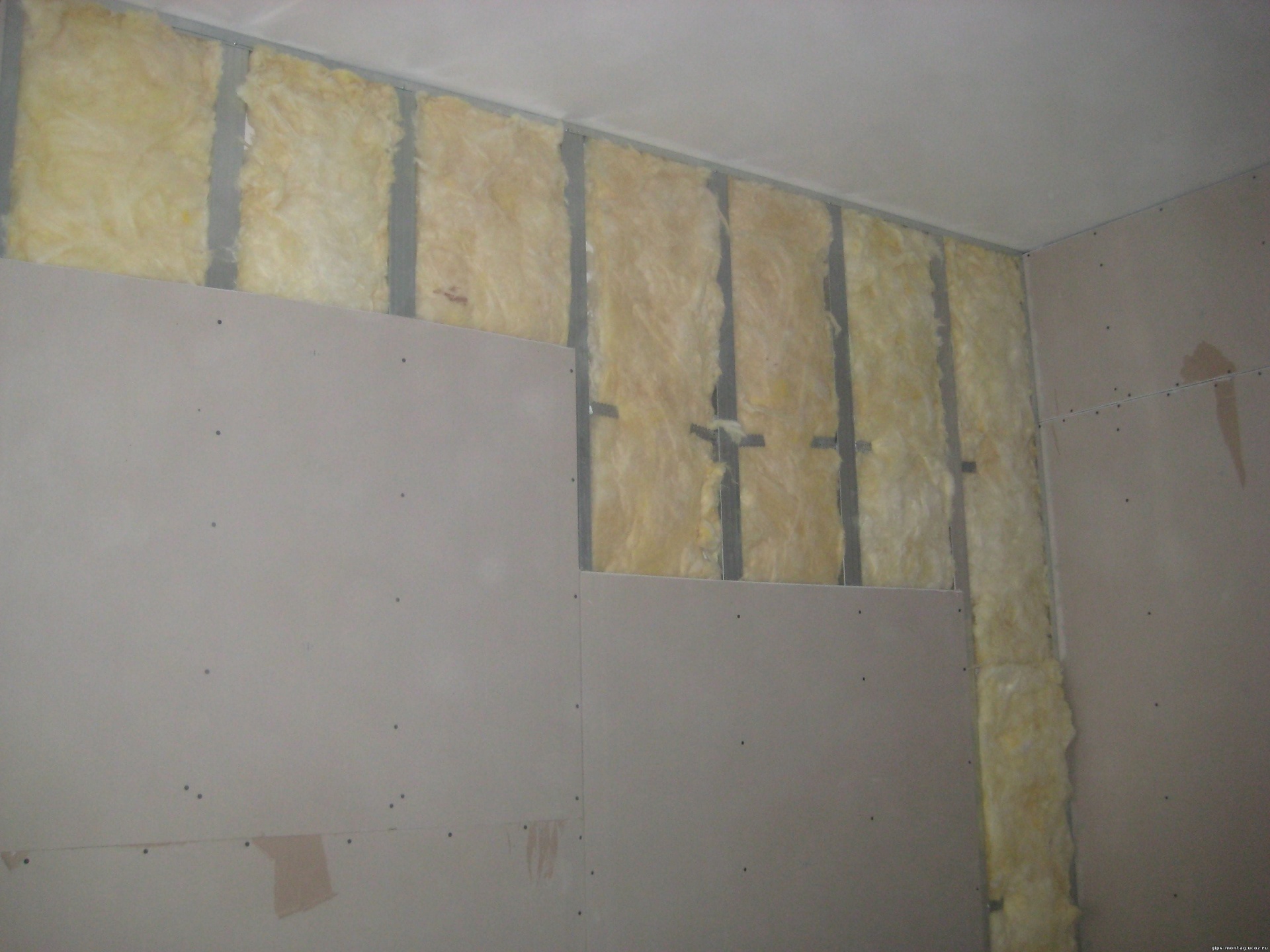 5. Каркас плотно заполняют звукоизолирующим материалом. Как самый дешевый вариант чаще всего предлагается минеральная вата. И в отличие от часто предлагаемого пенополистирола, который вопреки рекомендациям ничуть не помогает от шума, она действительно немного увеличивает звукоизоляционные свойства конструкции. Но лучше использовать акустическую минеральную вату, или другие специальные панели.