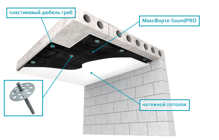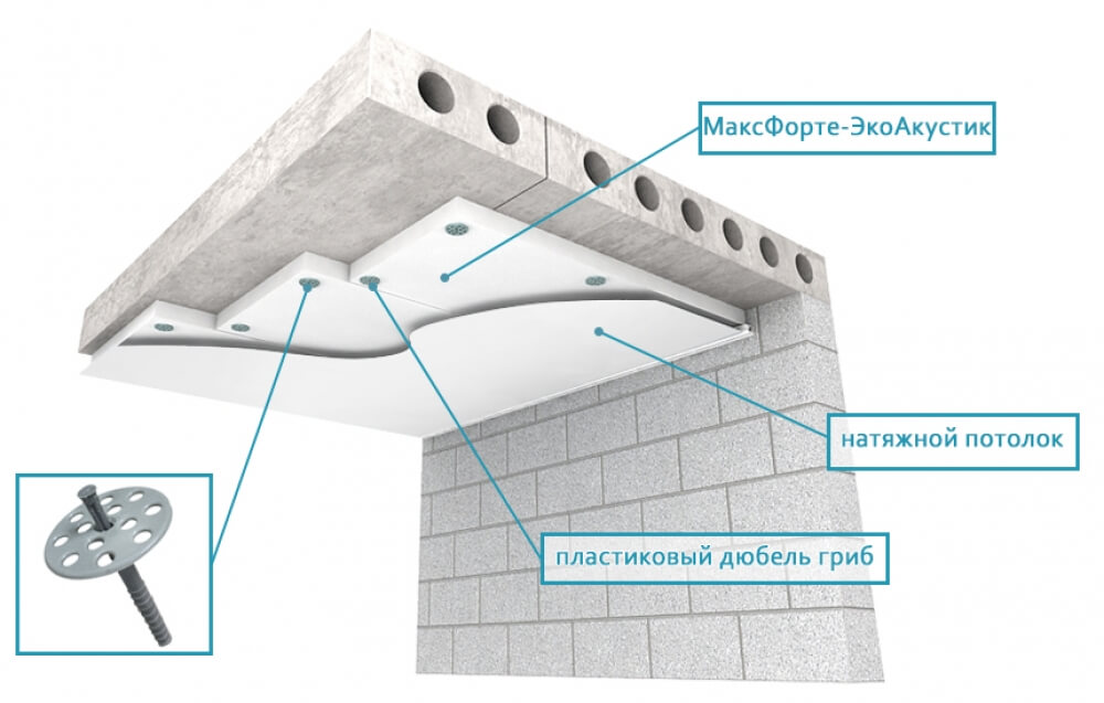 Как вариант, чтобы натяжное полотно не стало мембраной барабана, для шумопоглощения можно использовать крепление ваты на «грибки». Этот способ не защитит от имеющегося шума, но позволит предотвратить улучшение слышимости после монтажа.